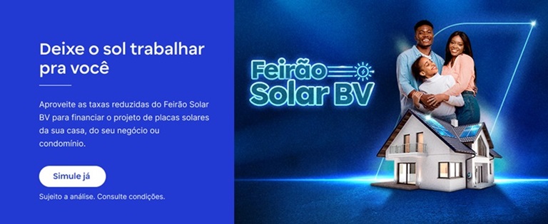 Pensando em expandir ainda mais as oportunidades de instalação de sistemas de energia solar para os brasileiros, o banco BV conta, anualmente, com o Feirão Solar BV. Essa iniciativa possibilita a contratação de um projeto de energia solar para a sua residência ou empresa com ofertas exclusivas.