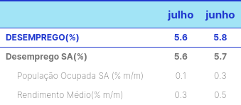 - Em julho o desemprego teve resultado em linha com o esperado caindo para 5.6% enquanto a expectativa do Banco BV era de 5.6%;