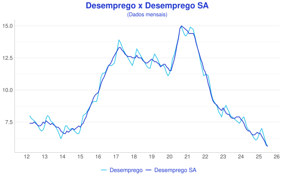A primeira análise a ser feita é a comparação entre os dados de desemprego e os dados de desemprego livres de sazonalidade, também conhecidos como dados sazonalmente ajustados (SA). Sazonalidade são padrões que se repetem em uma determinada parte do ano, como por exemplo índustrias que todos os anos aumentam sua produção temporariamente para suprir a demanda em algum período, ou setores de serviços que aumentam o número de funcionários para atender as festividades do final de ano. Todos esses comportamentos que se repetem acabam por gerar "ruído" no dado e dificultam sua análise, por isso geralmente são usados métodos estatísticos que nos permitem analisar os dados sem a interferência desses fatores.