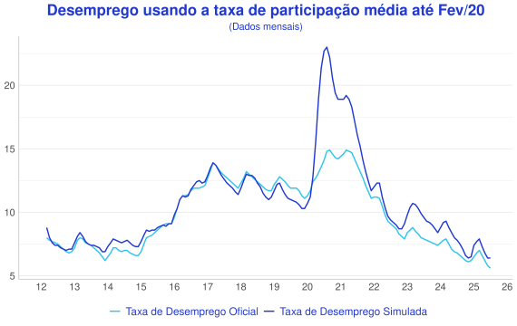 Historicamente a taxa de participação é um valor estável ao redor de 61%, porém como pode ser verificado no gráfico anterior, durante a crise de 2020 essa taxa teve uma queda abrupta. Por definição, uma taxa de participação menor significa uma força de trabalho menor, consequentemente, um nível de desemprego menor. O exercício abaixo compara a taxa de desemprego oficial contra um índice que simula qual seria o desemprego se a taxa de participação se mantivesse na média anterior a março de 2020, ou seja, se as pessoas que deixaram de procurar emprego durante a crise fossem computadas como desempregadas.