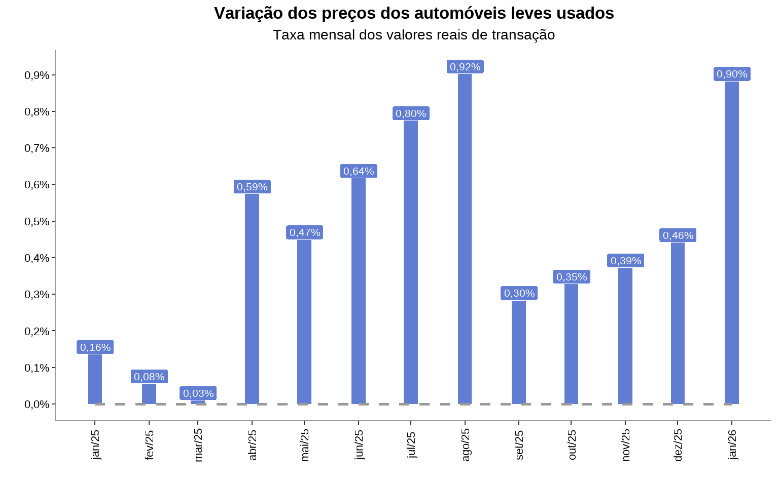 - Em janeiro, o índice de preços de automóveis leves usados registrou variação de 0,90% em relação ao mês anterior.