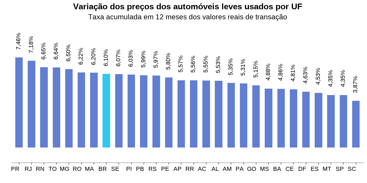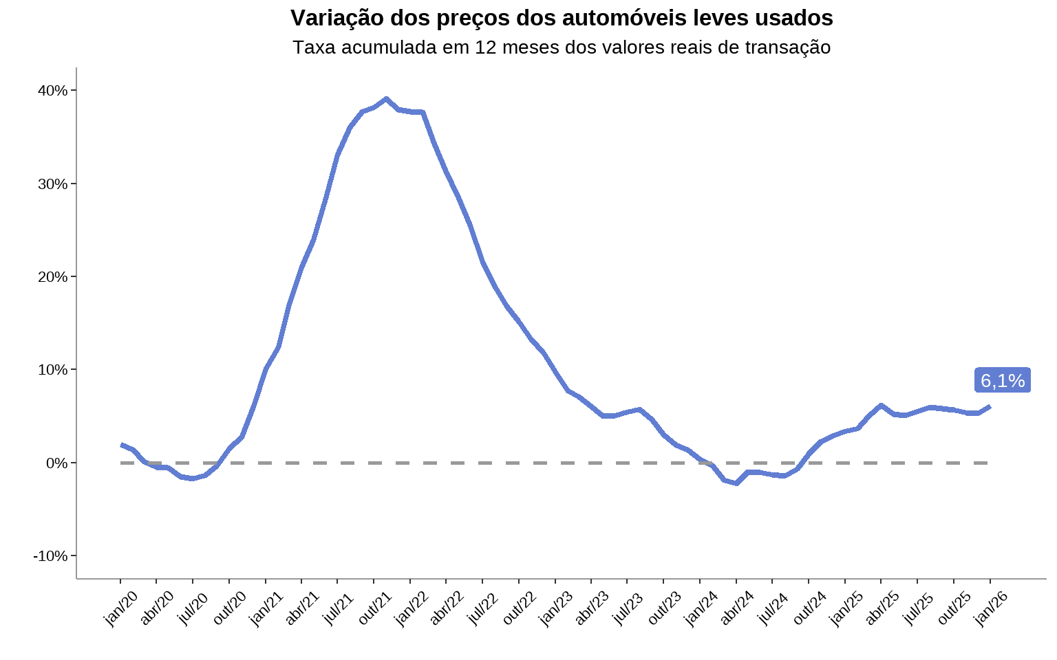 - No acumulado em 12 meses até janeiro, o indicador apresentou alta de 6,10% nos preços dos automóveis usados, registrando importante aceleração em relação ao resultado do mês anterior (5,31%).