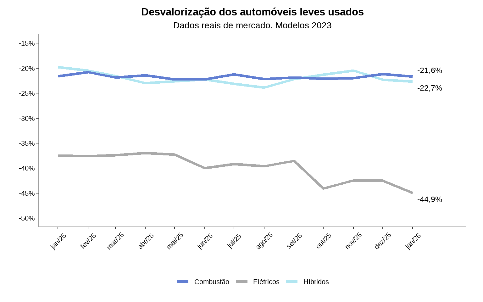 - Os modelos elétricos lançados em 2023 acumularam desvalorização de 44,9% até janeiro/2026, trajetória influenciada também pela queda nos preços dos veículos elétricos novos.