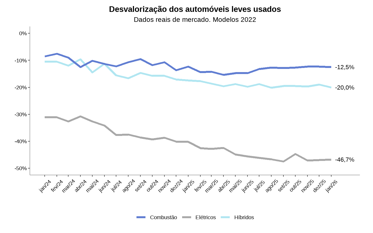 - A desvalorização média dos híbridos de 2022 ficou próxima de 23% em janeiro/2026. No mesmo período, a desvalorização média dos automóveis a combustão (modelos comparáveis) foi de 21,6%.