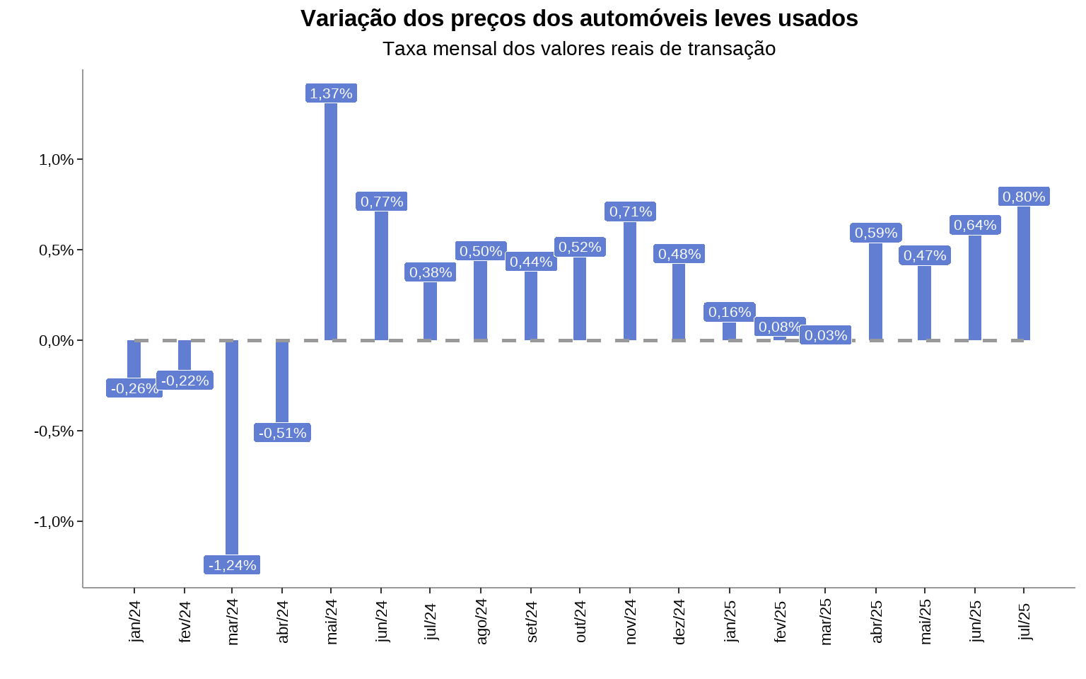 - Em julho, o índice de preços de automóveis leves usados teve alta de 0,80% em relação ao mês anterior.