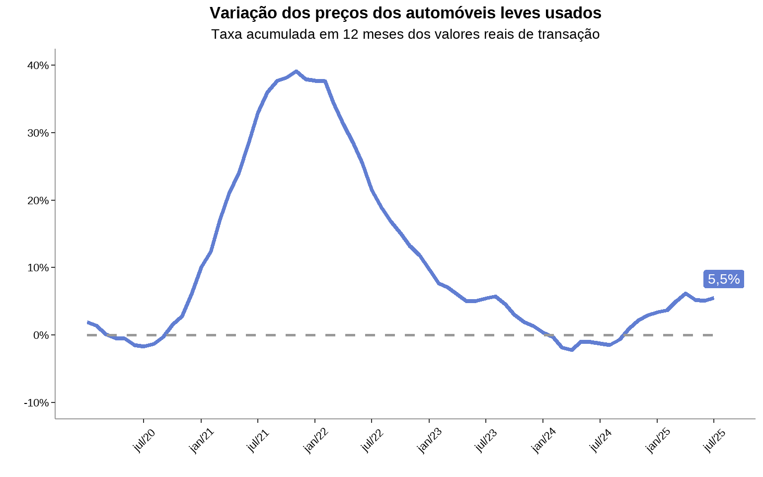 - No acumulado em 12 meses até julho, o indicador apresentou uma alta de 5,5% do preço dos automóveis usados.