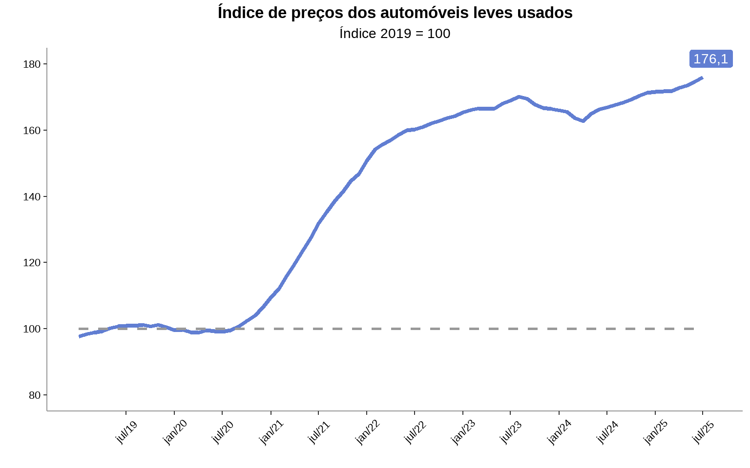 O índice utiliza o ano de 2019 como base histórica inicial, fixando o indicador nacional em 100, para permitir comparações ao longo do tempo até o mês mais recente de 2025. Nos índices regionais, a base é ajustada de acordo com a diferença média de preços em relação ao mercado nacional naquele ano. Isso garante que a série reflita com precisão a evolução dos preços e as diferenças regionais, oferecendo uma leitura mais apurada do mercado de usados.