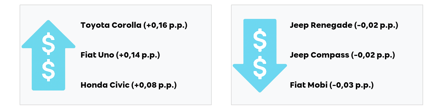 - A maior contribuição de alta, assim como no mês anterior, veio do Toyota Corolla, enquanto a de baixa veio do Fiat Mobi.