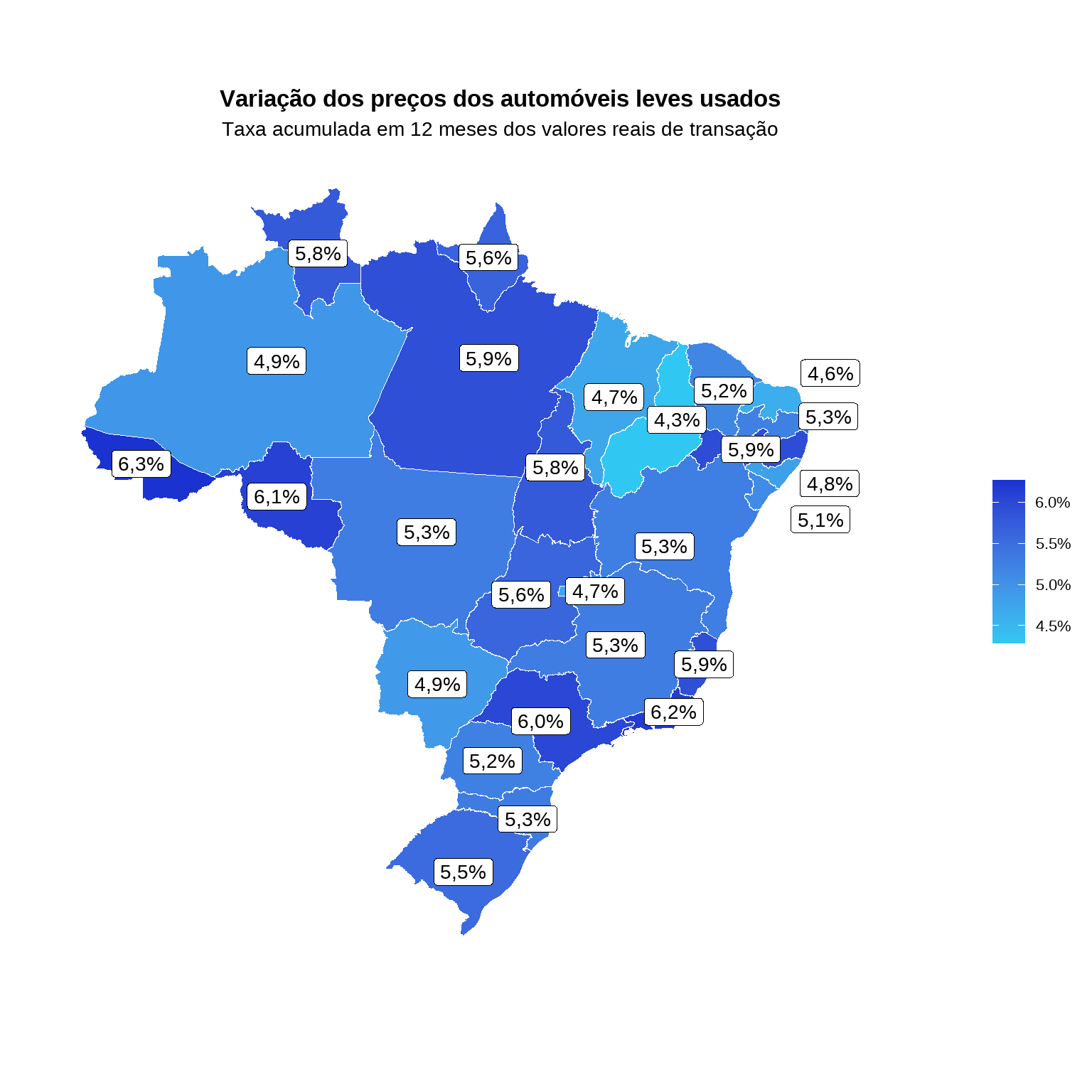 - No acumulado em 12 meses, destaca-se o estado do Acre, com alta de 6,3%, seguido pelo Rio de Janeiro, com 6,2%.