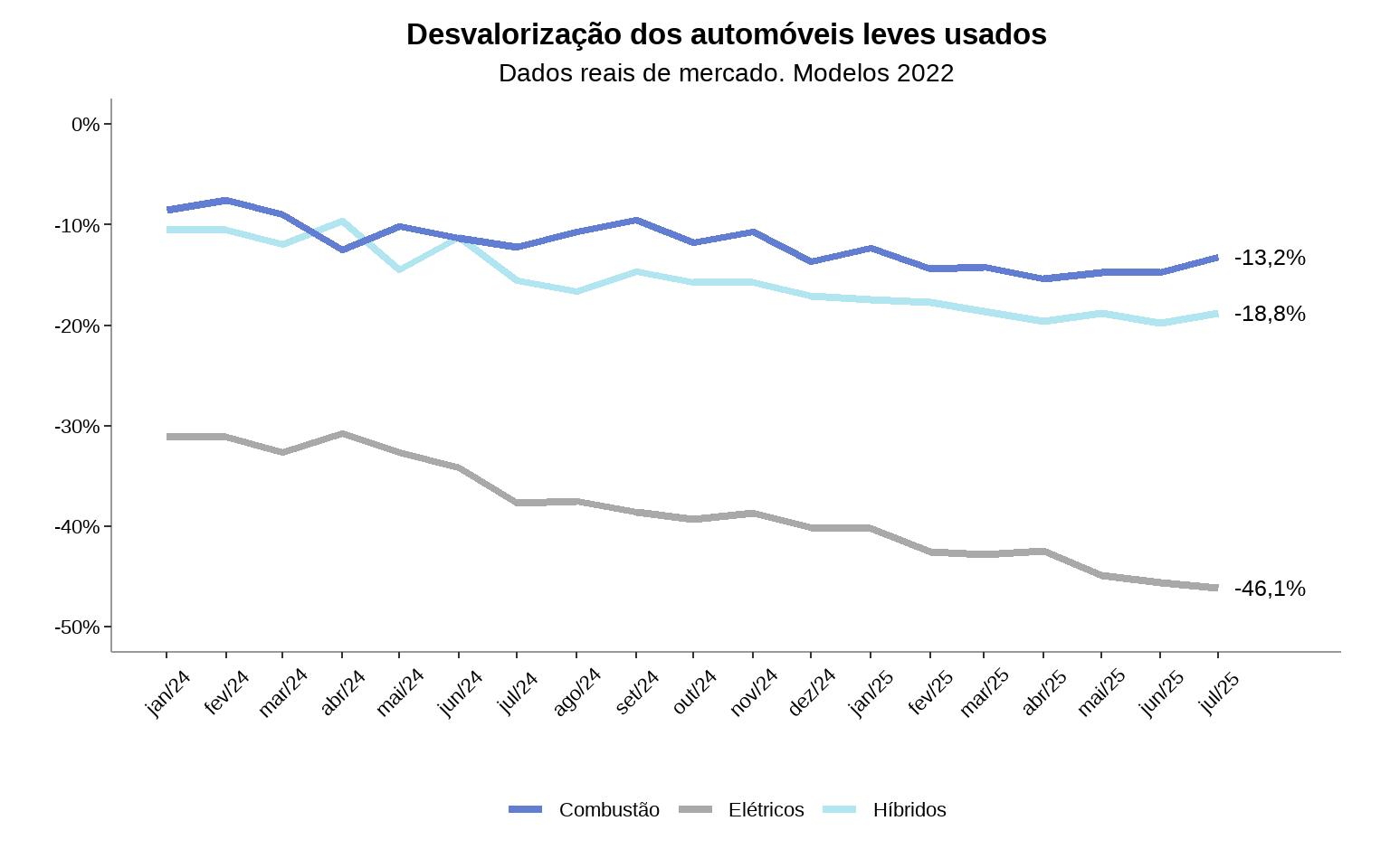 - Para os automóveis do ano de 2022, os modelos elétricos acumularam desvalorização superior a 46% até julho/25, trajetória que também é influenciada pela queda nos preços dos veículos elétricos novos.