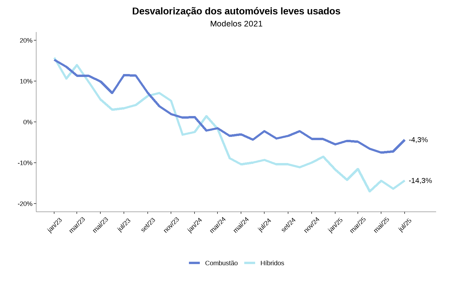 - Já a desvalorização média dos híbridos do ano de 2022 se aproximou de 19% em julho/25. No mesmo período, a desvalorização média dos automóveis a combustão (de modelos comparáveis) se manteve ao redor de 13%.