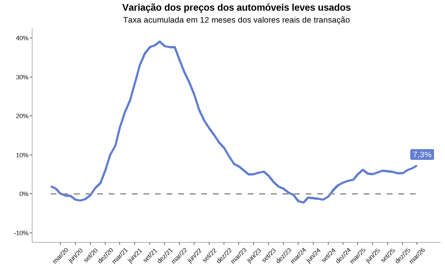 - No acumulado em 12 meses até março, o indicador apresentou alta de 7,33% nos preços dos automóveis usados.