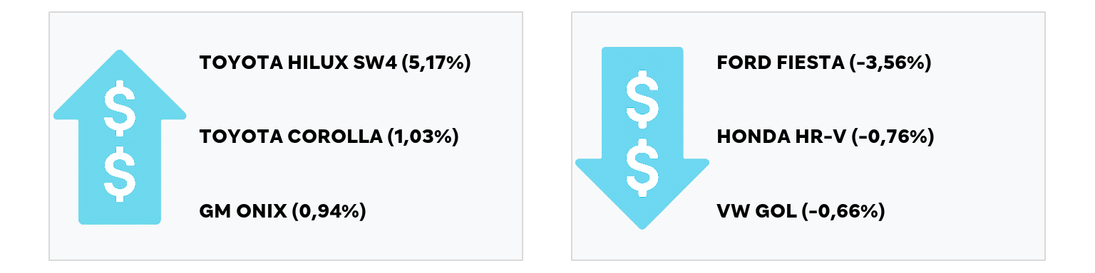 - A Hilux SW4, o Corolla e o Onix foram os veículos que mais contribuíram para a aceleração do índice em março, sendo que o Onix apareceu entre as maiores altas pelo segundo mês consecutivo.