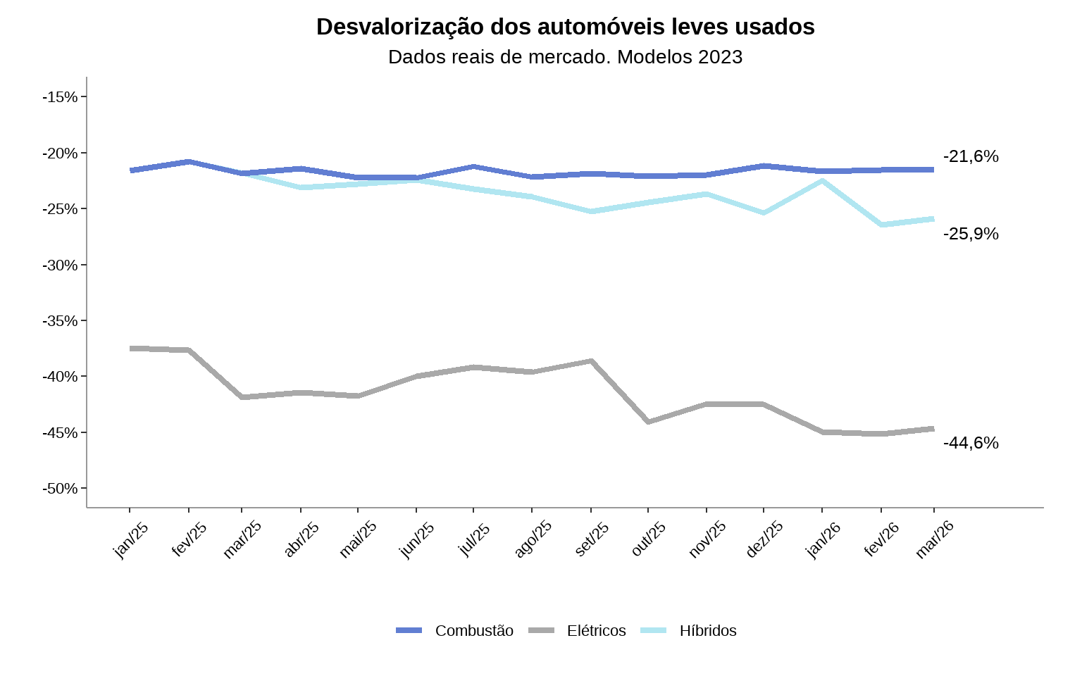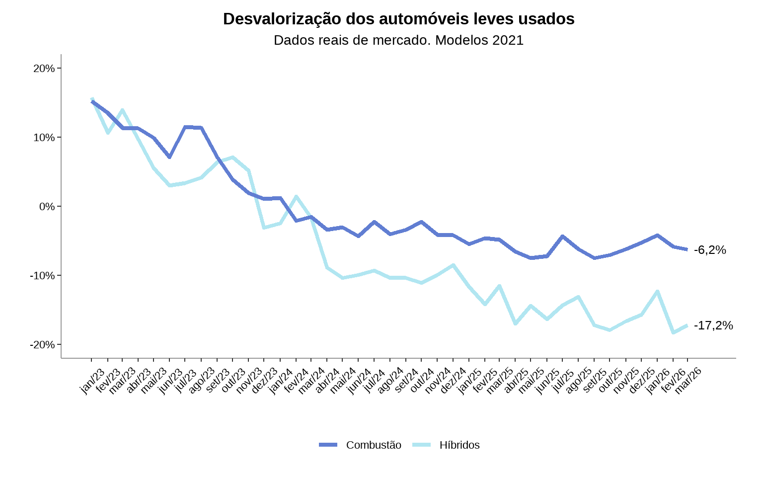 - A desvalorização média dos híbridos de 2023 foi de -25,9% até março de 2026. No mesmo período, a desvalorização média dos automóveis a combustão (modelos comparáveis) foi de -21,6%.