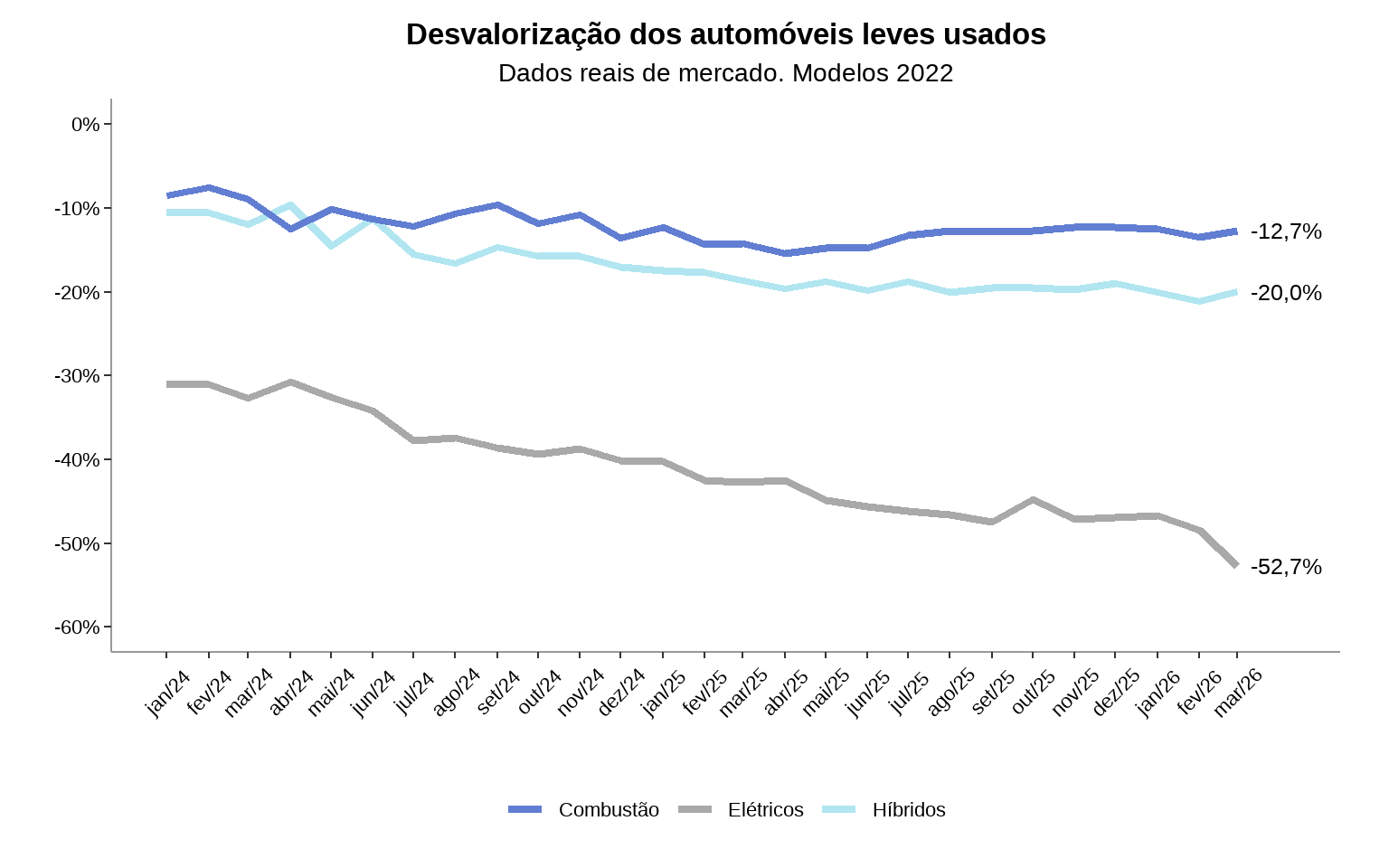- A desvalorização média dos híbridos de 2022 ficou em -20,0% até março de 2026. No mesmo período, a desvalorização média dos automóveis a combustão (modelos comparáveis) foi de -12,7%. Ambos os modelos têm mantido patamares similares de desvalorização desde meados de 2025.