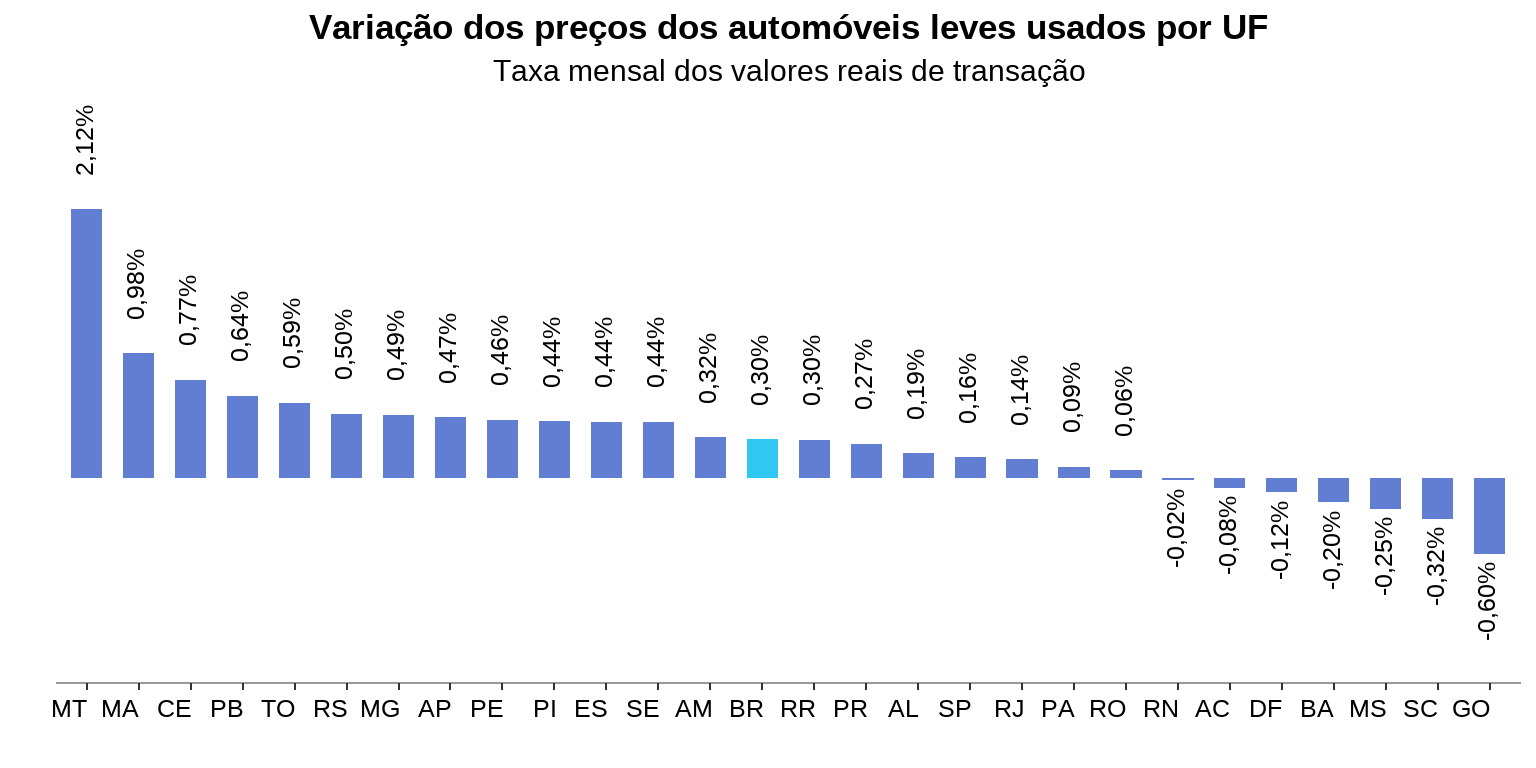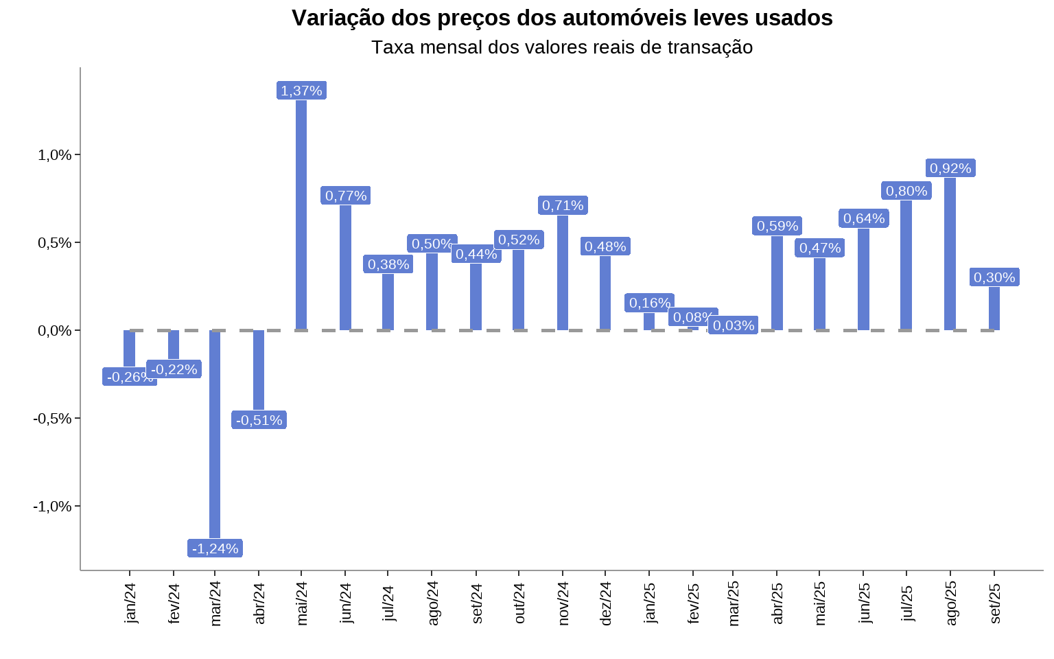 - Em setembro, o índice de preços de automóveis leves usados apresentou uma inflação de 0,30% em relação ao mês anterior.