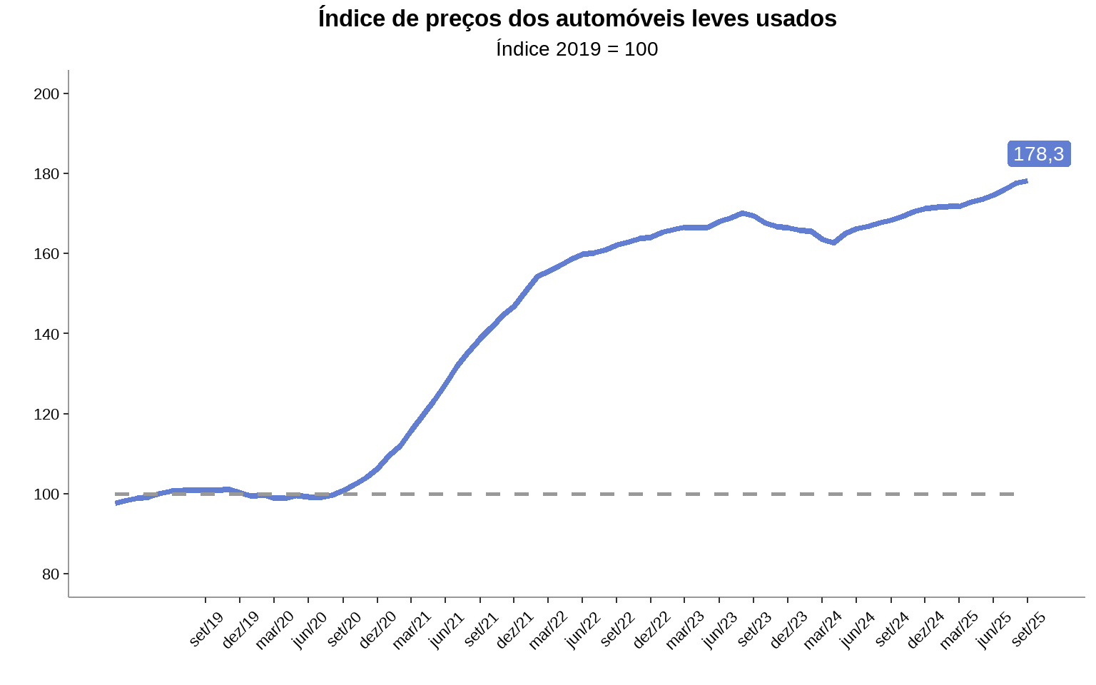 O índice utiliza o ano de 2019 como base histórica inicial, fixando o indicador nacional em 100, para permitir comparações ao longo do tempo até o mês mais recente de 2025. Nos índices regionais, a base é ajustada de acordo com a diferença média de preços em relação ao mercado nacional naquele ano. Isso garante que a série reflita com precisão a evolução dos preços e as diferenças regionais, oferecendo uma leitura mais apurada do mercado de usados.