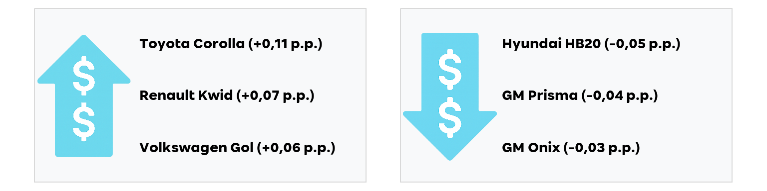 - A maior contribuição para a alta veio do Toyota Corolla, enquanto para a baixa veio do Hyundai HB20.