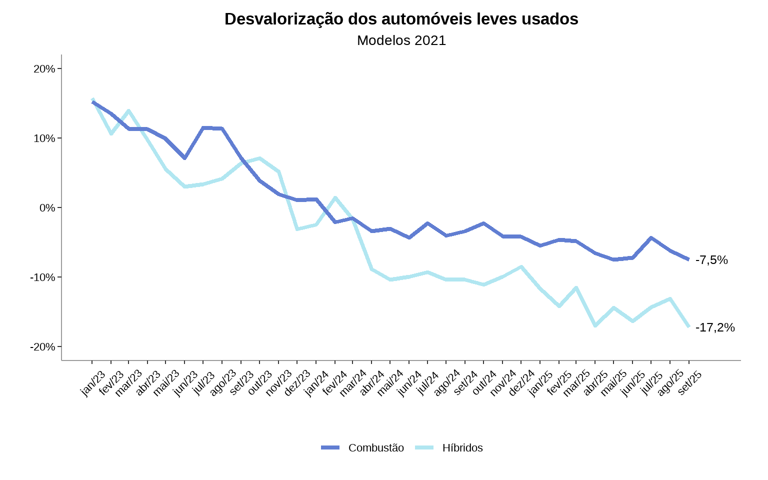 - Já a desvalorização média dos híbridos do ano de 2022 se aproximou de 20% em setembro/25. No mesmo período, a desvalorização média dos automóveis a combustão (de modelos comparáveis) se manteve ao redor de 13%.