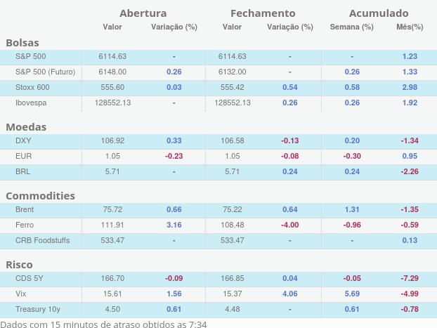 Fontes:Bloomberg, Banco BV. Dados com 15 minutos de atraso obtidos as 7:34