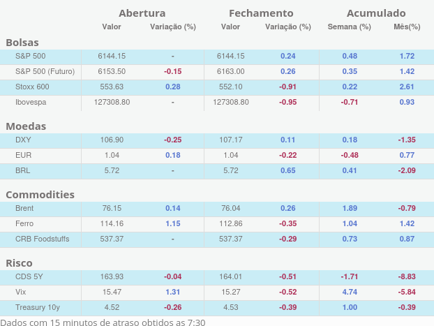 | | Este relatório foi elaborado pelo Banco BV e as informações nele contidas são públicas, meramente informativas e não constituem recomendações, assessorias ou orientações de investimento por parte do BV. O seu conteúdo é destinado exclusivamente à(s) pessoa(s) e/ou organizações indicadas no endereçamento eletrônico, e suas informações não podem, sob qualquer forma ou pretexto, serem utilizadas, divulgadas, alteradas, impressas ou copiadas, total ou parcialmente, por pessoas não autorizadas pelo Banco BV. Dúvidas, sugestões e reclamações, entre em contato com o Serviço de Atendimento ao Cliente pelo telefone 0800 728 0083 ou pelo e-mail sac@bv.com.br. Deficientes auditivos e de Fala: 0800 701 8661. Se desejar entrar em contato com a Ouvidoria, ligue para 0800 707 0083 (Deficientes Auditivos e de Fala: 0800 701 8661). | |