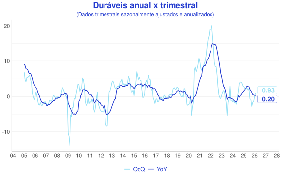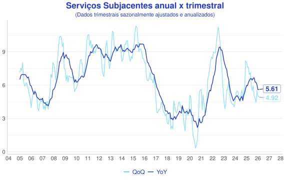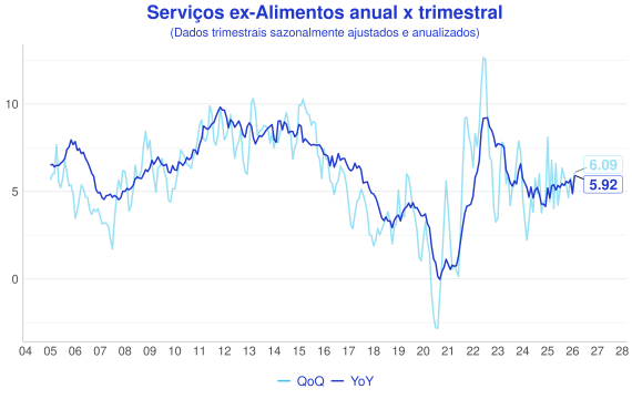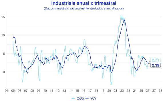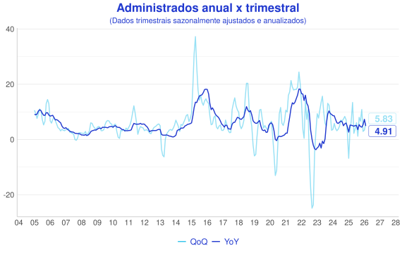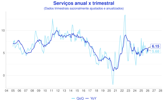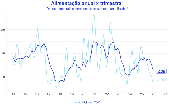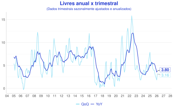 Além da comparaçao mensal, outra forma interessante de avaliação é a comparação entre a série acumulada nos ultimos 12 meses (anual/YoY) e o acumulado do trimestre anualizado com ajuste sazonal(QoQ). A ideia é que a série anual representa uma série mais estável, enquanto a trimestral é mais sensível aos dados novos e permite uma visão melhor do índice "na ponta".