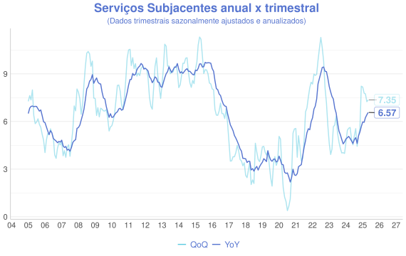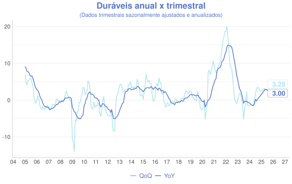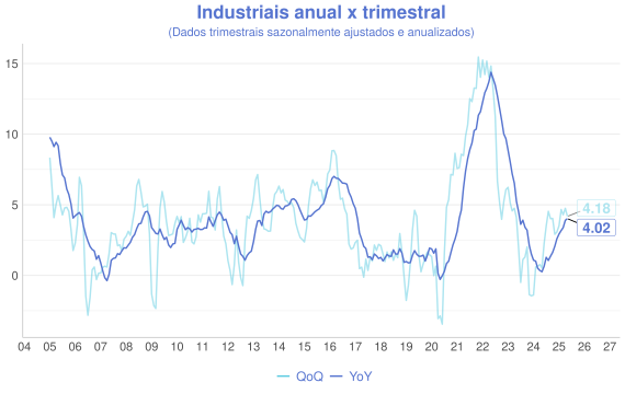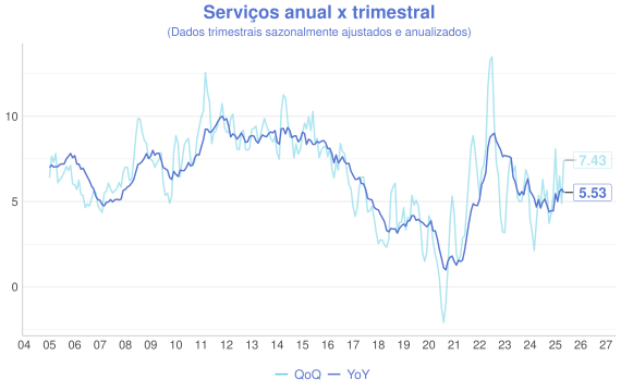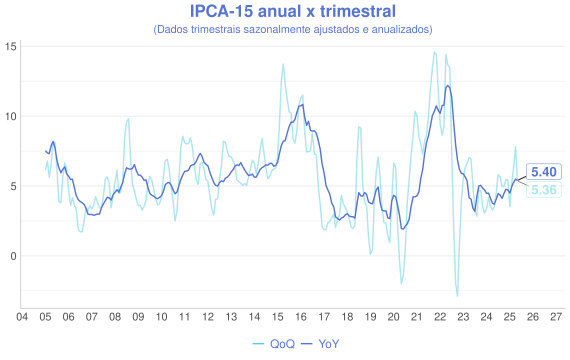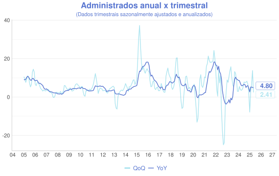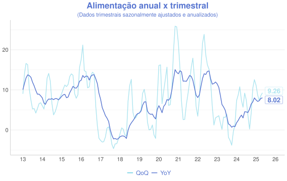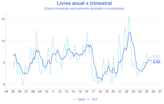 Além da comparaçao mensal, outra forma interessante de avaliação é a comparação entre a série acumulada nos ultimos 12 meses (anual/YoY) e o acumulado do trimestre anualizado com ajuste sazonal(QoQ). A ideia é que a série anual representa uma série mais estável, enquanto a trimestral é mais sensível aos dados novos e permite uma visão melhor do índice "na ponta".