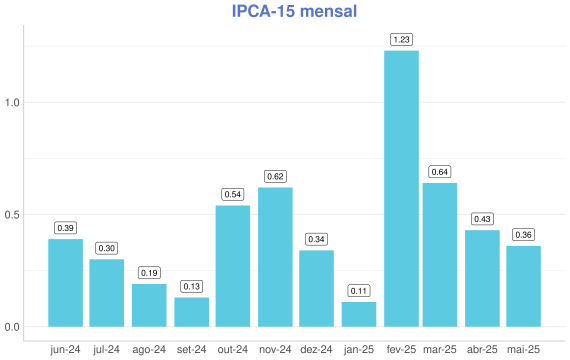 - Em maio o IPCA-15 teve resultado abaixo do esperado variando 0.36% no mês. A nossa expectativa era de 0.47%;
