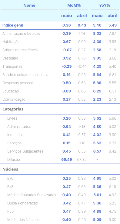 - Analisando os grupos, o grupo com maior impacto positivo em maio foi saúde e cuidados pessoais contribuindo com 0.12% no índice;