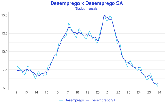 A primeira análise a ser feita é a comparação entre os dados de desemprego e os dados de desemprego livres de sazonalidade, também conhecidos como dados sazonalmente ajustados (SA). Sazonalidade são padrões que se repetem em uma determinada parte do ano, como por exemplo índustrias que todos os anos aumentam sua produção temporariamente para suprir a demanda em algum período, ou setores de serviços que aumentam o número de funcionários para atender as festividades do final de ano. Todos esses comportamentos que se repetem acabam por gerar "ruído" no dado e dificultam sua análise, por isso geralmente são usados métodos estatísticos que nos permitem analisar os dados sem a interferência desses fatores.