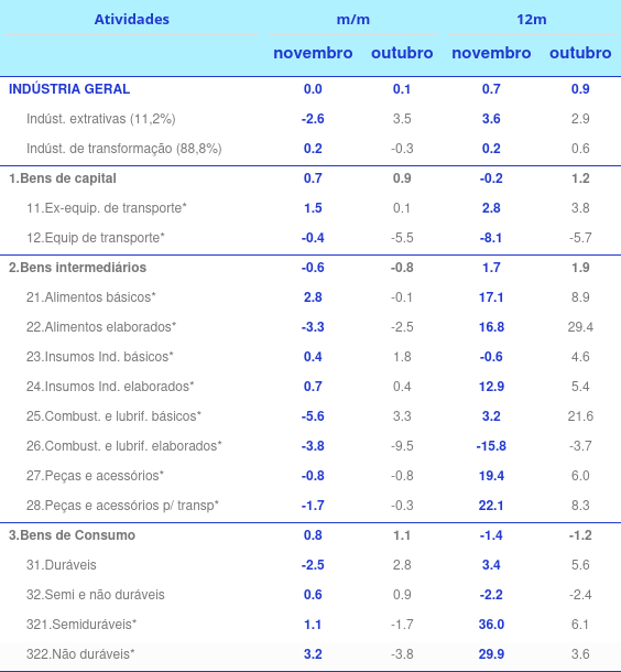 - Em novembro a indústria surpreendeu positivamente apresentando estabilidade no período enquanto a expectativa do Banco BV era de recuo de 0.1%;