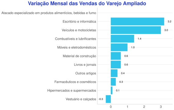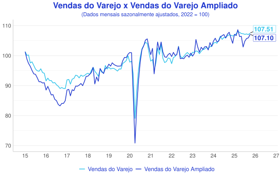 - Analisando o acumulado dos últimos 12 meses, as vendas do varejo avançaram 1.7%, enquanto o varejo ampliado se manteve estável;