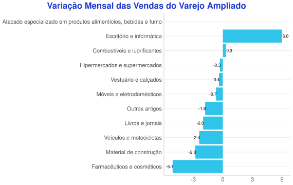 - Analisando o acumulado dos últimos 12 meses, as vendas do varejo avançaram 1.6%, enquanto o varejo ampliado avançou 0.1%;